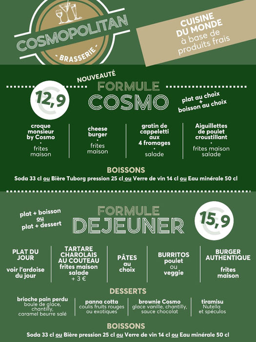 Le Cosmopolitan, une brasserie où nature et convivialité s’unissent pour des moments chaleureux et authentiques. Venez profiter d’une ambiance unique, d’une cuisine savoureuse et d’un accueil attentionné.